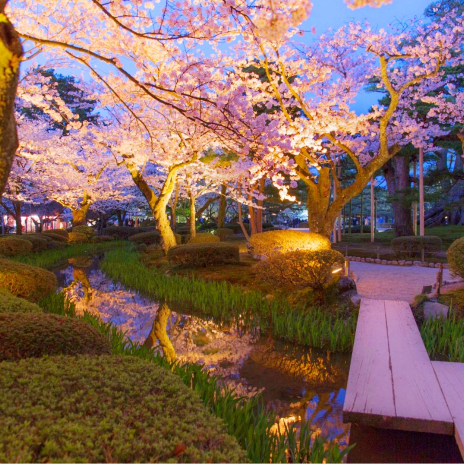Evening: Marvel at Kenrokuen Garden 's illuminated weeping cherries reflecting in mirror ponds like floating pink islands under moonlight.